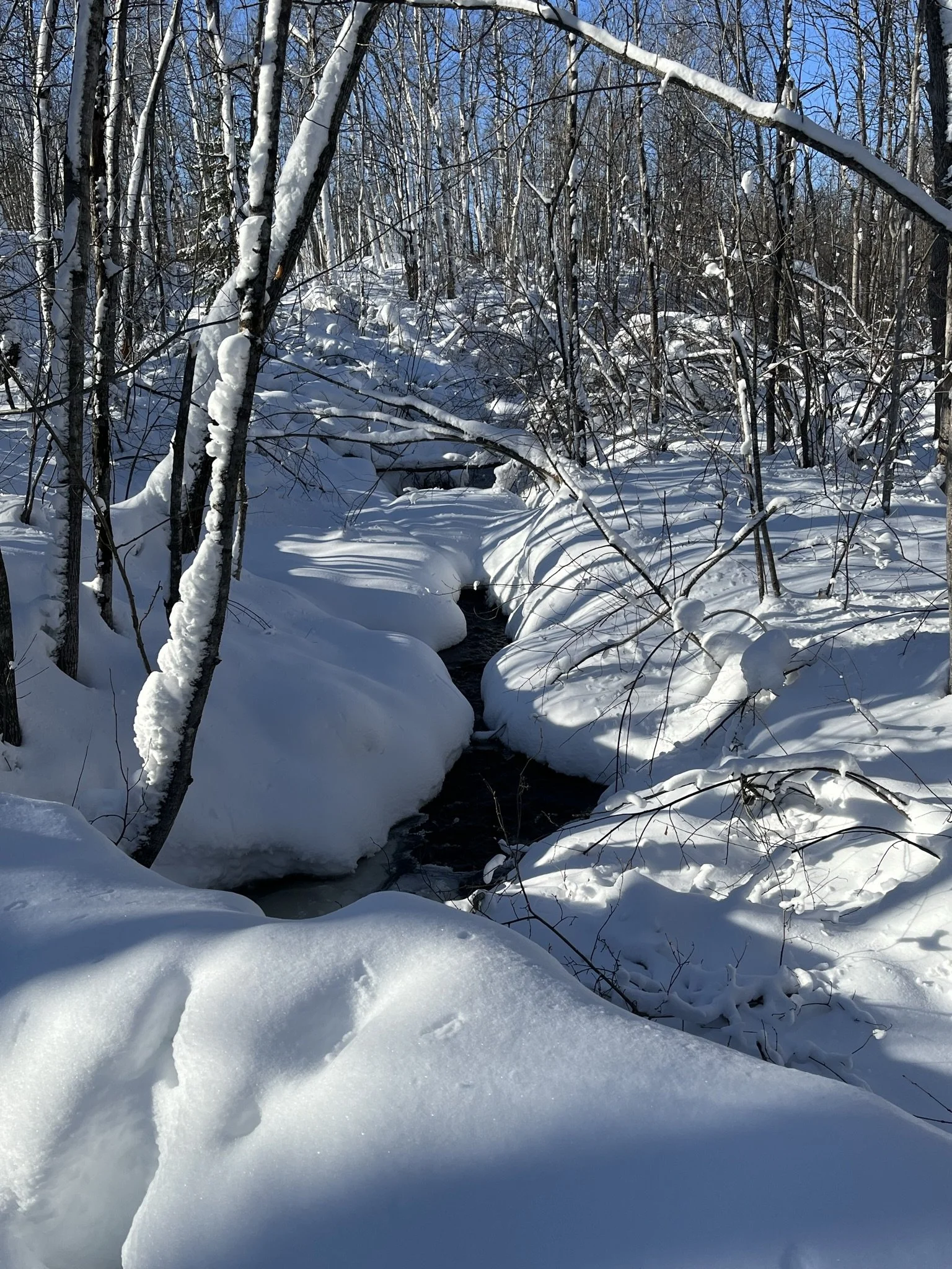 My walk in the woods on this windless day began in the particular hush that only accompanies a fresh blanket of snow. It is a peaceful stillness -- the only sound the crunch of the snow under my boots and the gentle trickling of the Amity beneath the ice. I immersed myself in the calm and tranquility of the snow-laden forest.